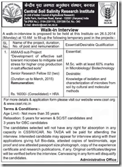 Central Soli Salinity Research Institute (CSSRI - A Unit of Indian Council of Agriculture Research (ICAR)) Karnal Walk in Interview for the post of Senior Research Fellow (SRF) under AMAAS sub Project "Development of effective salt tolerant microbes to mitigate salt stress for higher crop production in salt affected soils" (Duration up to March 2015) . Walk in interview will be held on 26th May 2014.