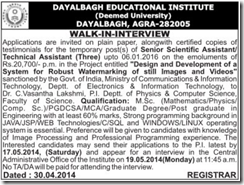 Dayalbagh Educational Institute (Deemed University) Agra (U.P.) - Walk in Interview for the temporary post of Senior Scientific Assistant/ Technical Assistant upto 06.01.2016 in the Project entitled "Design and Development of a System for Robust Watermarking of still Images and Videos" sanctioned by the Govt, of India. Ministry of Communications & Information Technology, Deptt. of Electronics & Information Technology, to Dr. C.Vasantha Lakshmi, P.I. Deptt. of Physics & Computer Science, Faculty of Science.