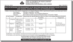 Steel Authority of India Limited (SAIL - A Government of India Enterprise) Rourkela Steel Plant Walk in interview for Engagement of Senior Registrar, Registrar, Resident House Officer in ISPAT General Hospital, Rourkela On Stipendiary Basis. Walk in Interview will be held on 16th and 17th June 2014.